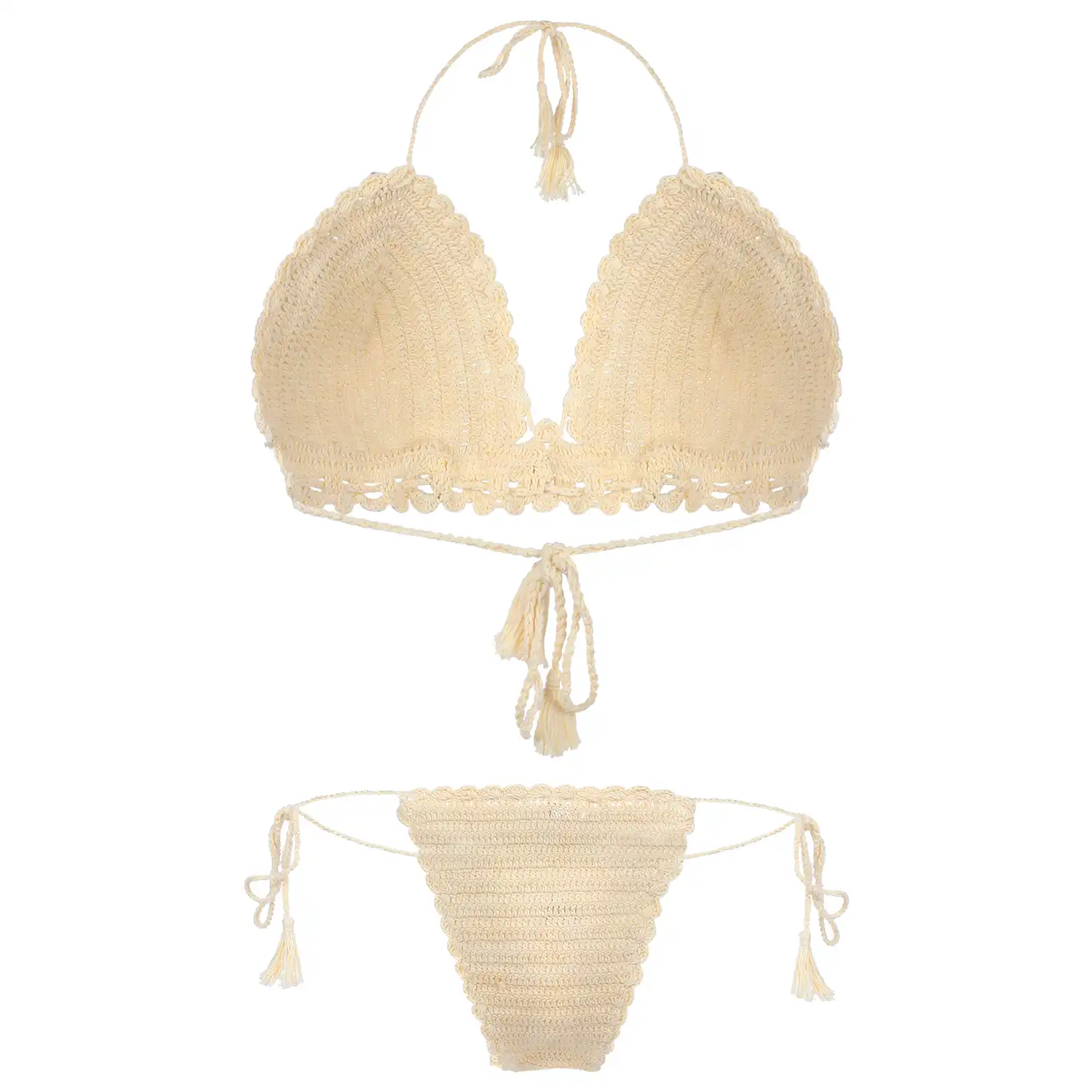 Women’s Tie Side Tassels Beige Color Crochet Lingerie